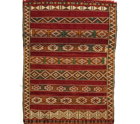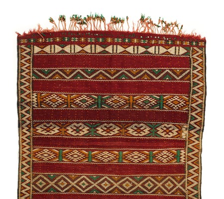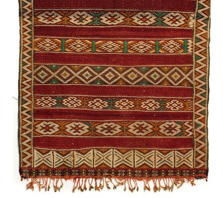 Antique kilim with some fringes missing; otherwise, in perfect condition.