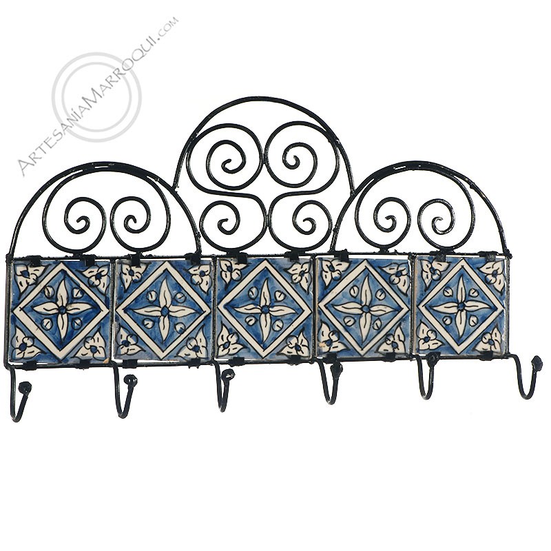 Wrought iron coat rack with six hooks and five tiles.