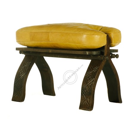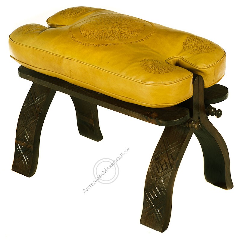 Banqueta desmontable de madera con cojín de color amarillo, tiene grabados árabes en la parte superior. Se envía relleno y cierra con cremallera. Banqueta muy estable y decorativa. Los motivos de los grabados y de las patas pueden variar de unos a otros.