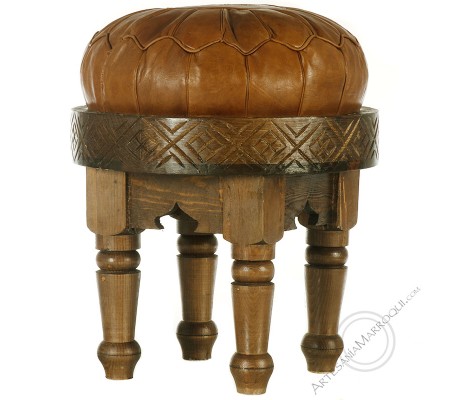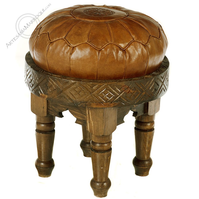 Banqueta redonda de madera con cojín de cuero desmontable.
