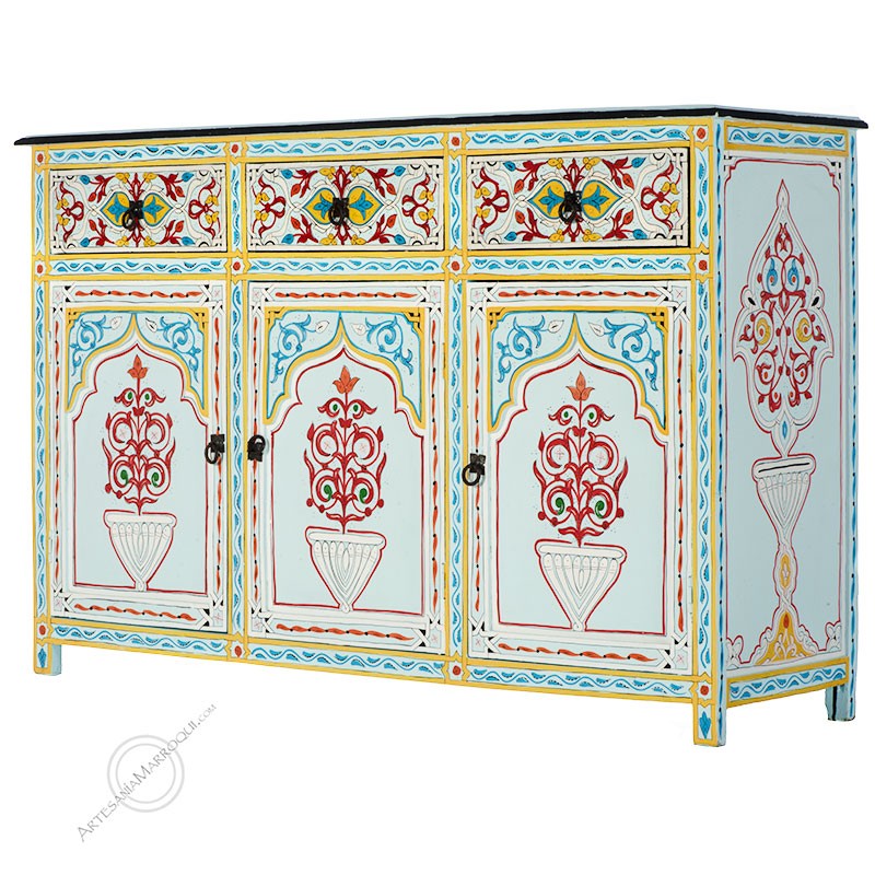 Aparador árabe de tres puertas y tres cajones de color celeste dibujos pintados , tanto en el frontal como los laterales y la tapa . El interior está dividido por una balda .
