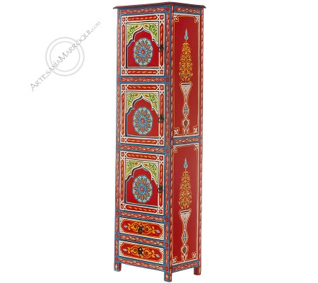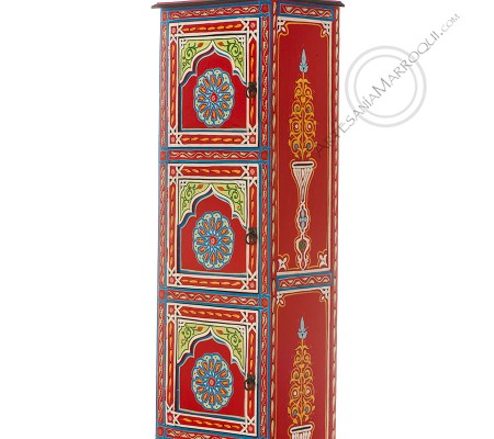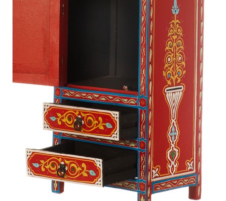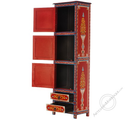 Aparador de tres puertas y dos cajones de color rojjo Las puertas están hechas con la técnica mousharabi o celosía y abren a la izquierda. Los paneles laterales también están decorados con dibujos de colores.
