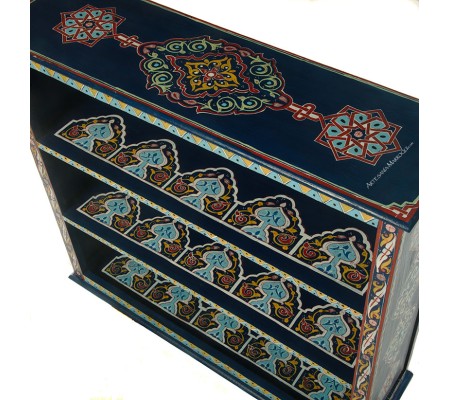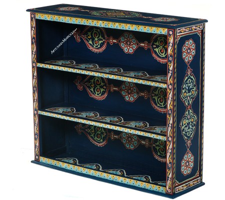 Librería de madera pintada de color azul oscuro, con dibujos árabes en los laterales, las baldas y la tapa superior.