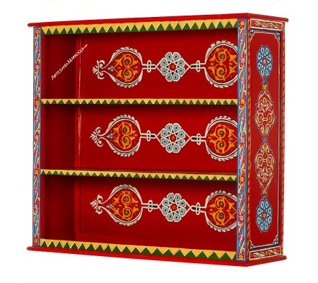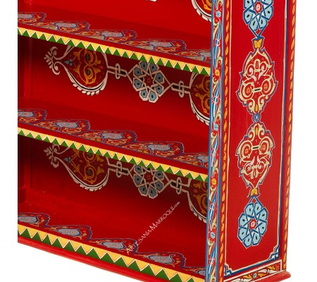 Librería de madera pintada de color rojo, con dibujos árabes en los laterales, las baldas y la tapa superior.