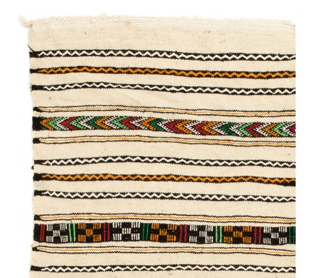 Kilim sin lavar con colores originales, fondo de lana blanca con dibujos en colores.
