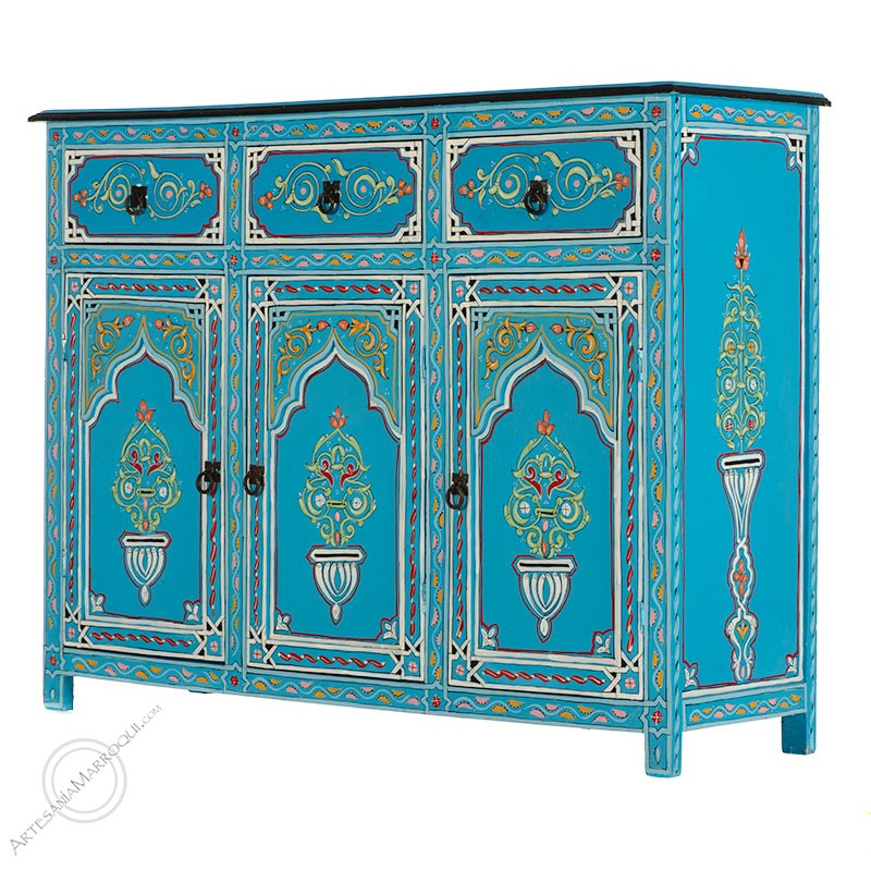 Buffet trois portes bleu. Décoré de motifs élégants sur la façade, les côtés et le dessus. L'intérieur est divisé par une étagère. Disponible dans d'autres coloris sur demande.