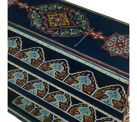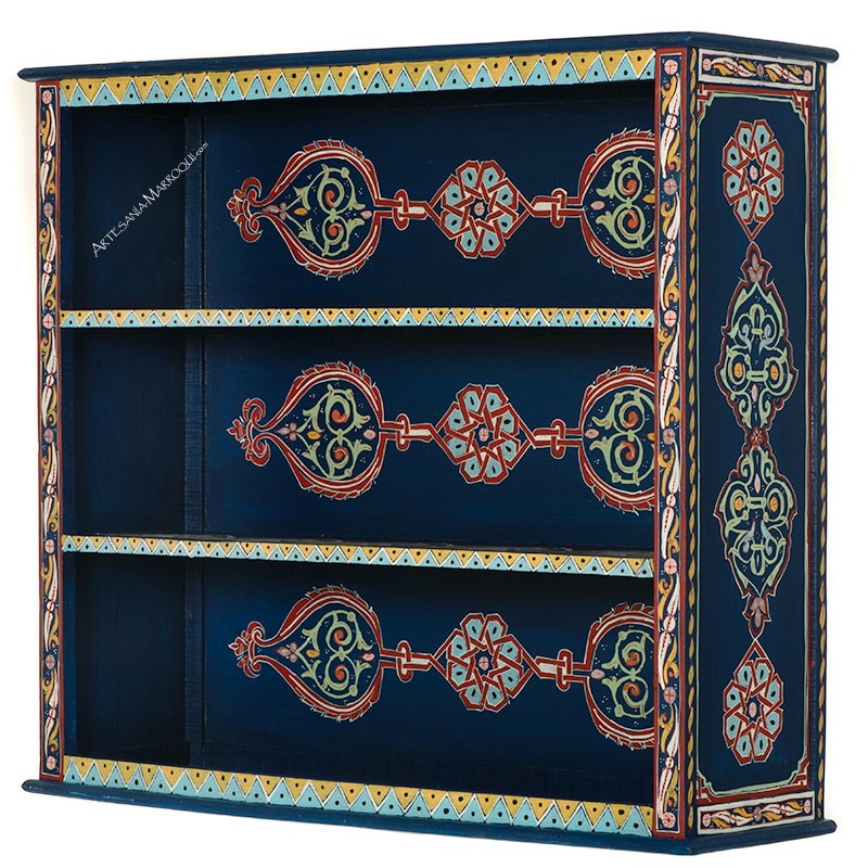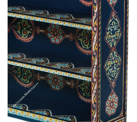 Bibliothèque en bois peint en bleu foncé, ornée de motifs arabes sur les côtés, les étagères et le dessus.