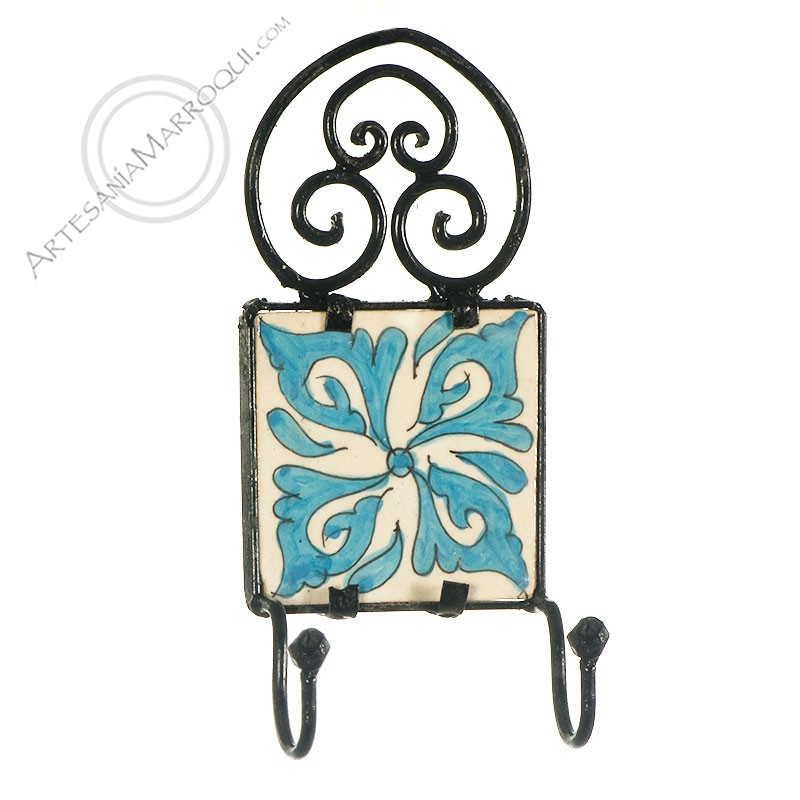 Porte-manteau en fer forgé avec carrelage décoratif et deux crochets.