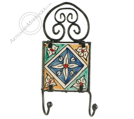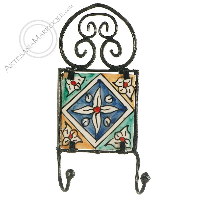 Porte-manteau en fer forgé avec carrelage décoratif et deux crochets.
