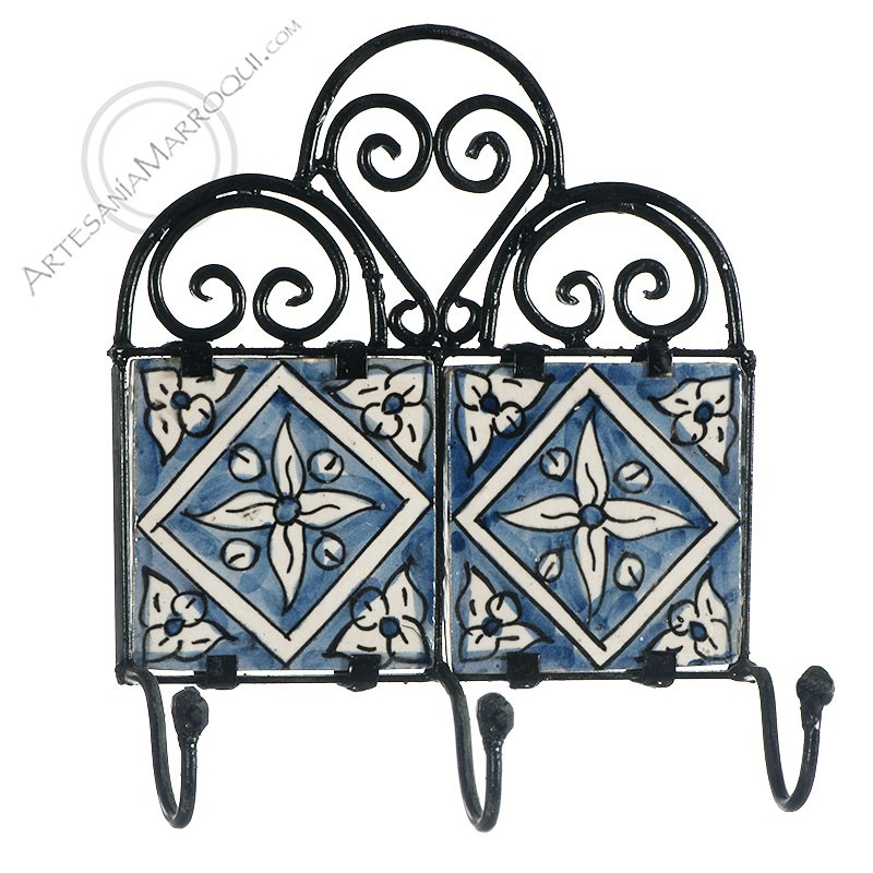 Porte-manteau en fer forgé avec deux carreaux décoratifs et trois crochets.