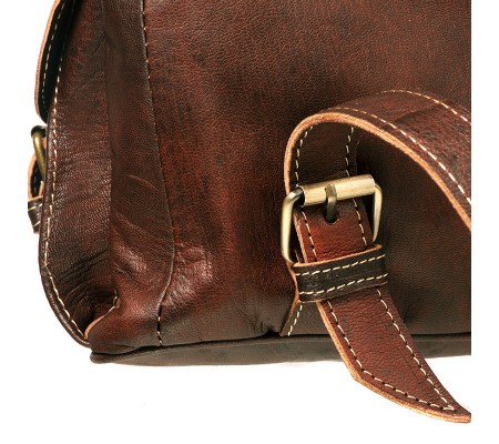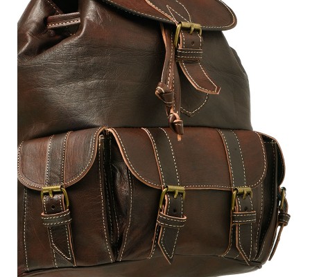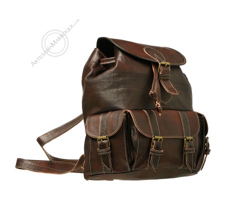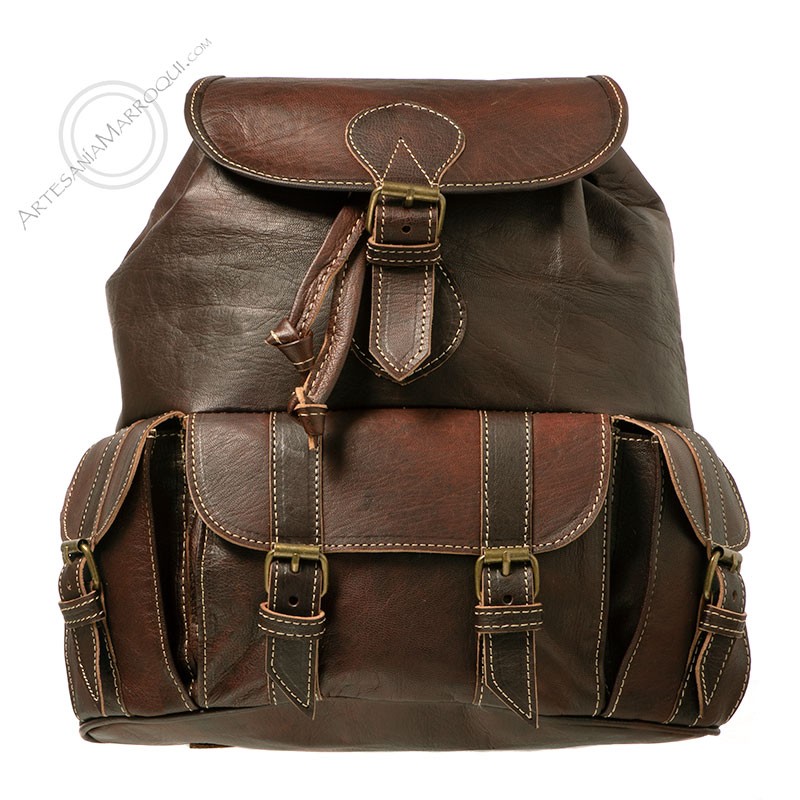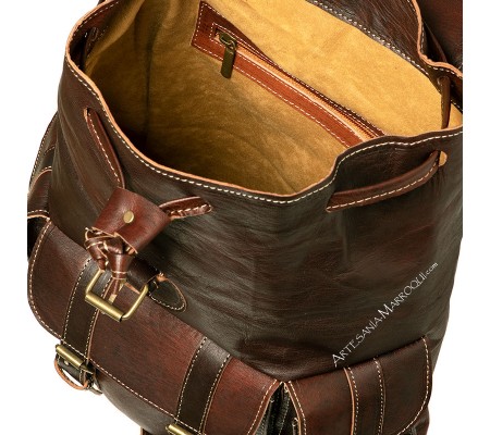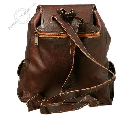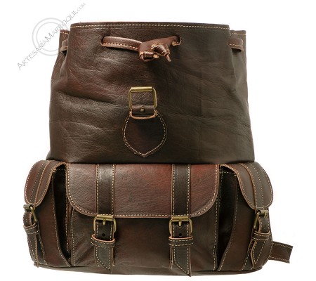 Sac à dos en cuir avec trois poches avant, une autre poche zippée à l'arrière ou un autre intérieur. Fini teinté brun foncé. Doublure en daim.
