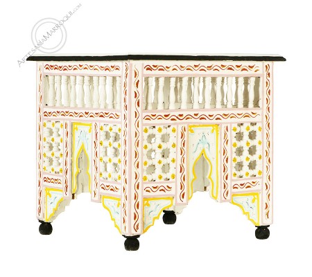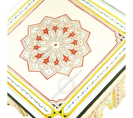 Belle et solide table carrée blanche, décorée de mousharabi (treillis) sur les côtés.